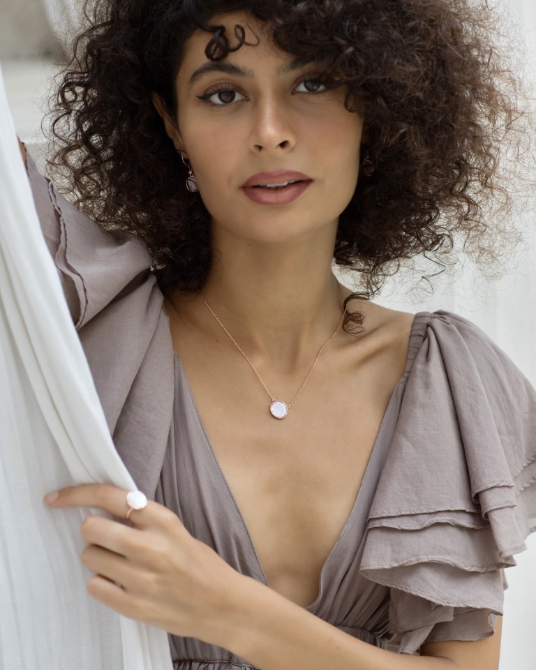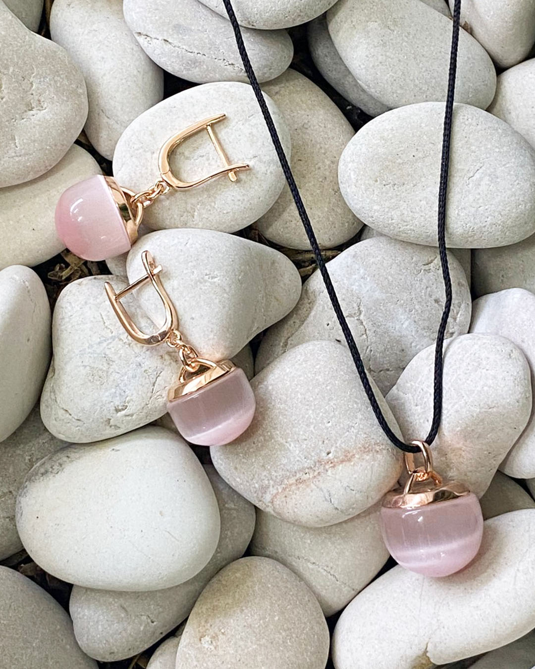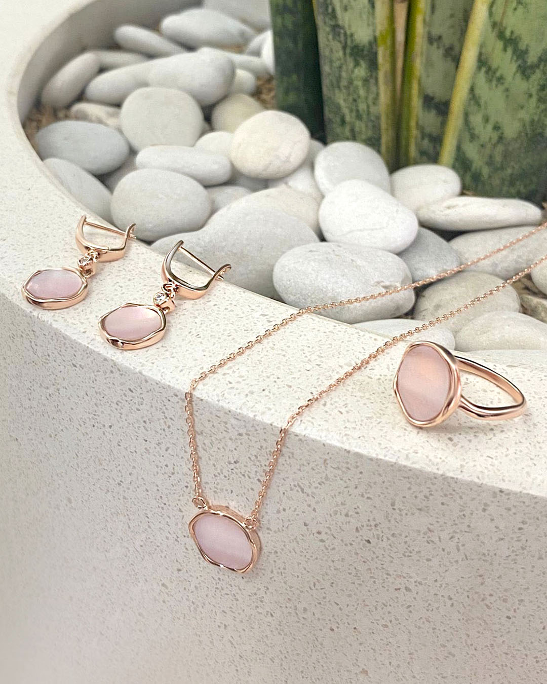 Explore our Rounded Pink Mother of Pearl Rose Gold Necklace earrings and ring. For a hint of gold, don’t miss our Moon CatEye Gold Plated pendant and earrings.
