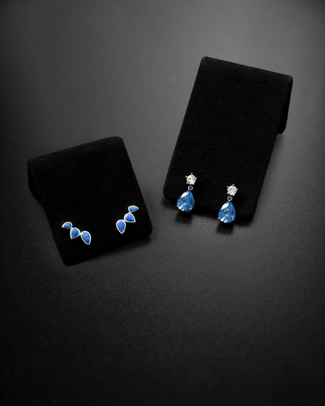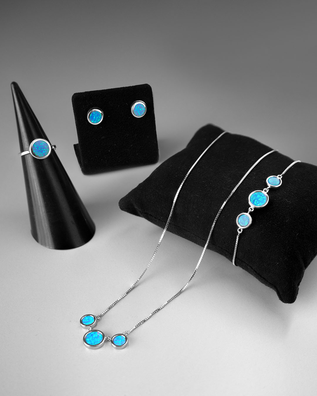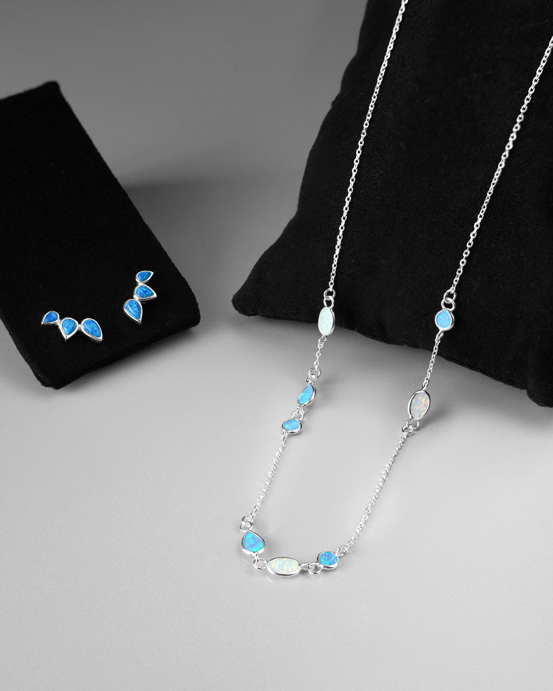 The most loved white and blue opal necklace pairs well with the Nimbus opal silver earrings, while the three opal silver necklace and bracelet are everyone’s forever favorites.